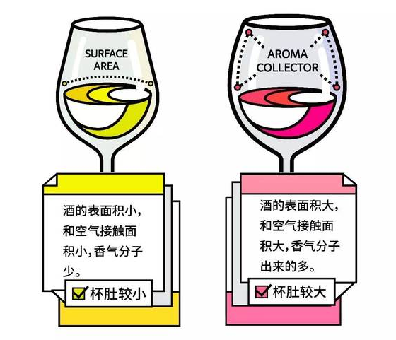简单总结即,杯肚越大液体与空气接触面越大,而接触面的大小将直接影响其香气的释放程度,单位时间内释放越多的香气红酒的味道便越好。