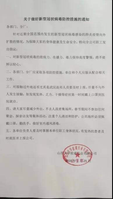 近日,新型冠状病毒疫情还在持续,全国多省份均启动了重大公共卫生突发事件一级响应机制。新型冠状病毒疫情的防控工作已得到党中央及各级政府的高度重视,公司各部门、各分厂负责人从思想上、行动上高度重视疫情的防控工作,将公司相关通知要求落实到位。