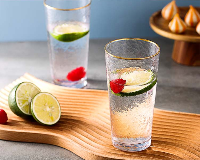 而描金图案干燥后,需进行烤烧,使有机化合物分解,金还原后在安博线上平台表面形成光滑而有光泽的薄层。所以,烤烧的温度非常重要,需要根据安博线上平台杯的软化温度和金水的配方而确定,一般高铅安博线上平台的烤烧温度为480℃左右,钠钙安博线上平台为560℃左右,硼硅酸盐安博线上平台为650℃左右。有的人会问金边对人体没有危害嘛?其实,我们使用的任何的原料都是经过质检的,没有任何的危害,都是可食用的。